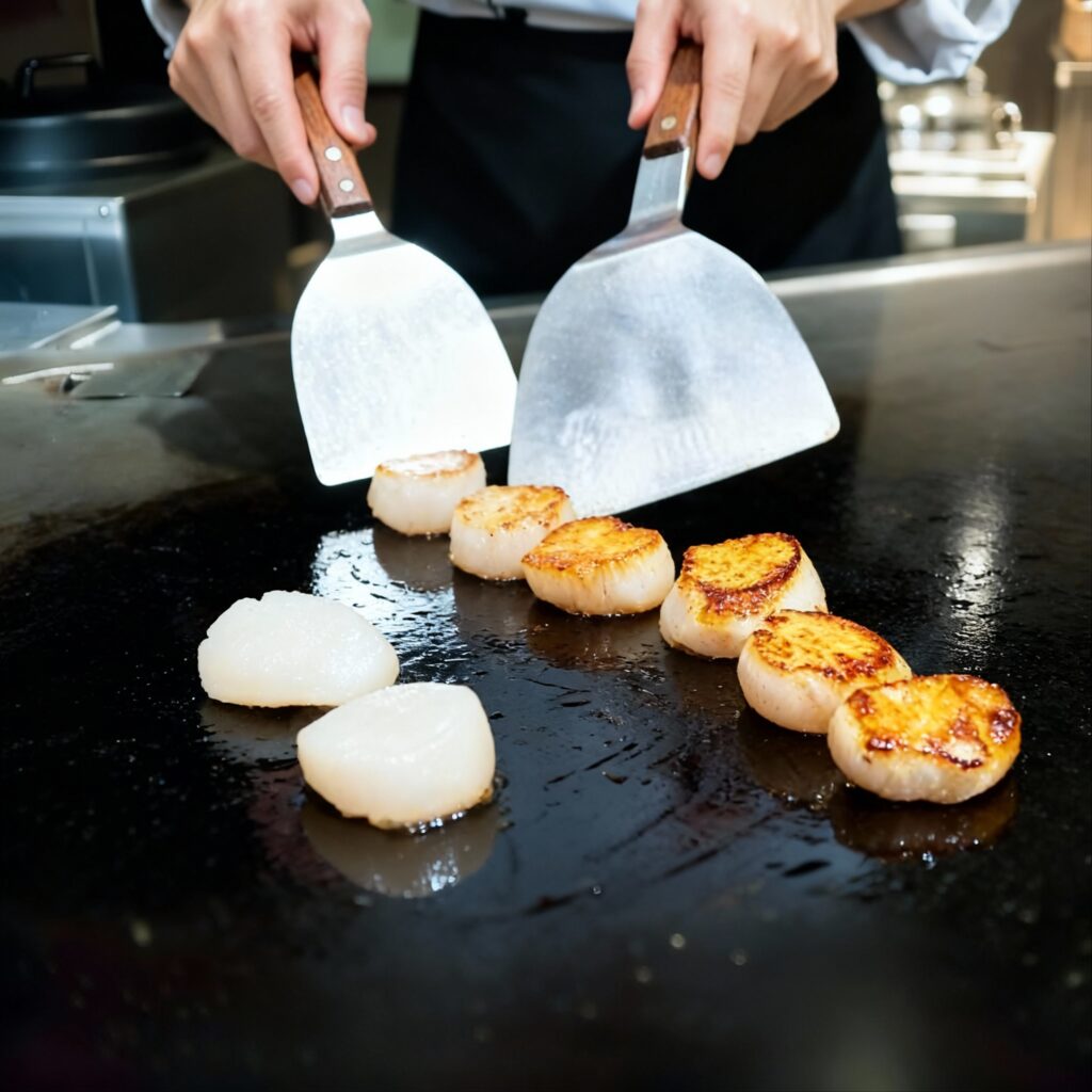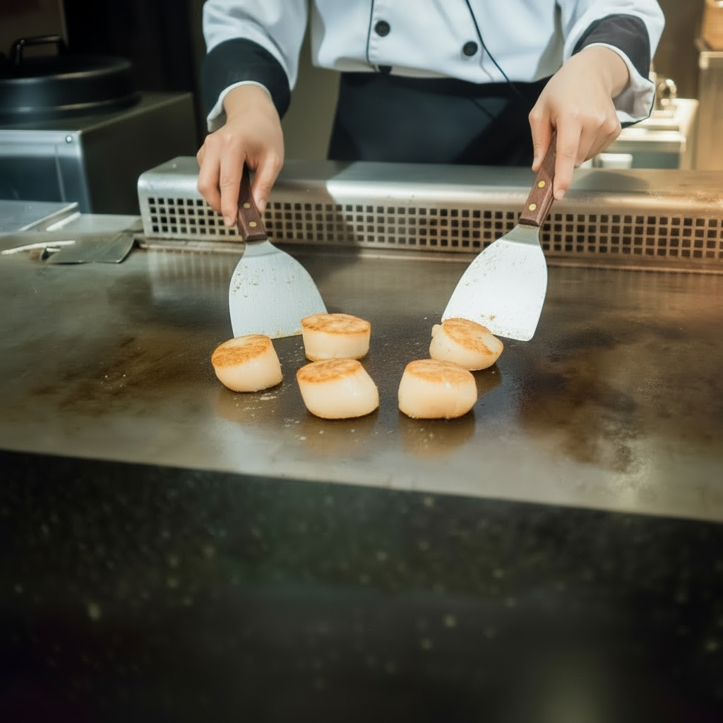 鐵板上,生食級干貝被主廚輕輕放下。 表面滋滋作響,外層漸轉金黃,內裡仍柔潤如玉。那香氣,是純淨的海洋氣息;那甜味,像雪融後的清泉。
